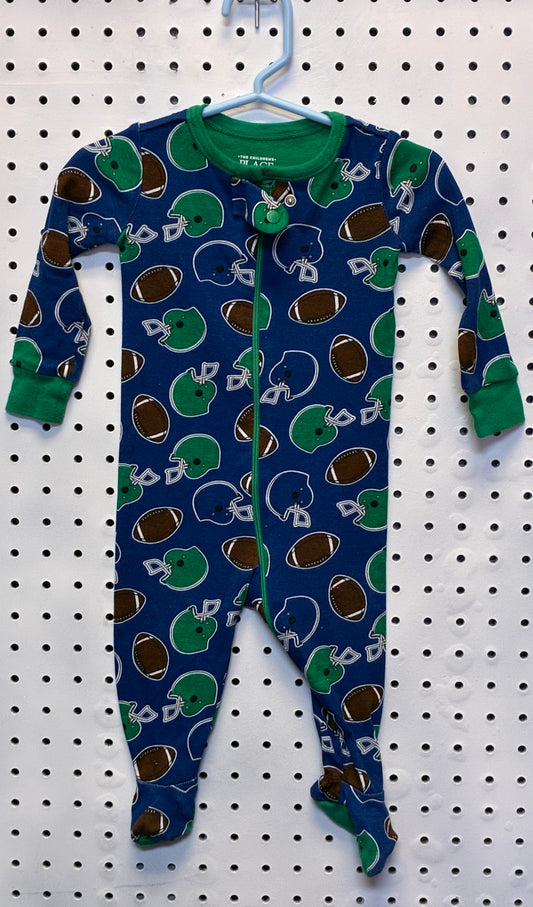 Carter's or The Children's Place boys' blue and green football-themed fleece footed pajama sleeper Size 3-6M