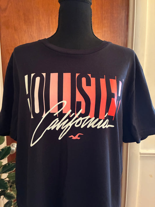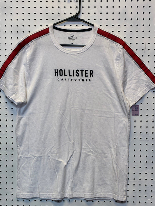 Hollister California men's crew neck t-shirt with red striped shoulders, Size Large