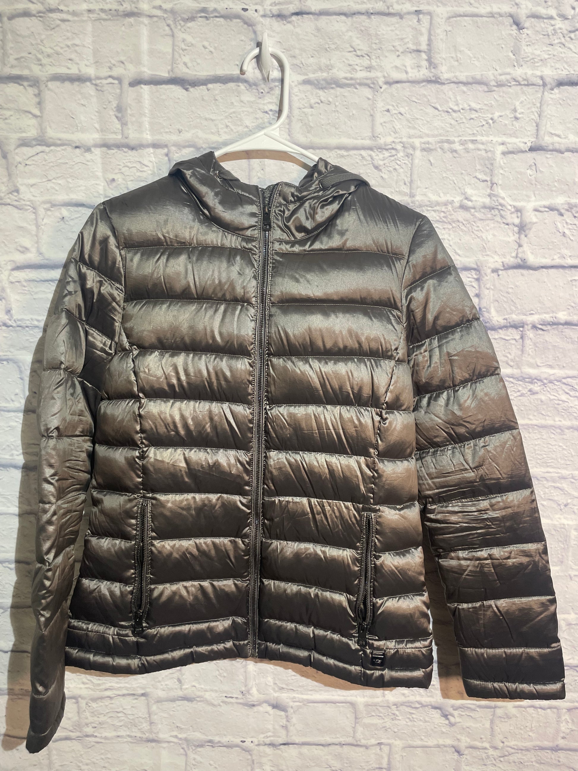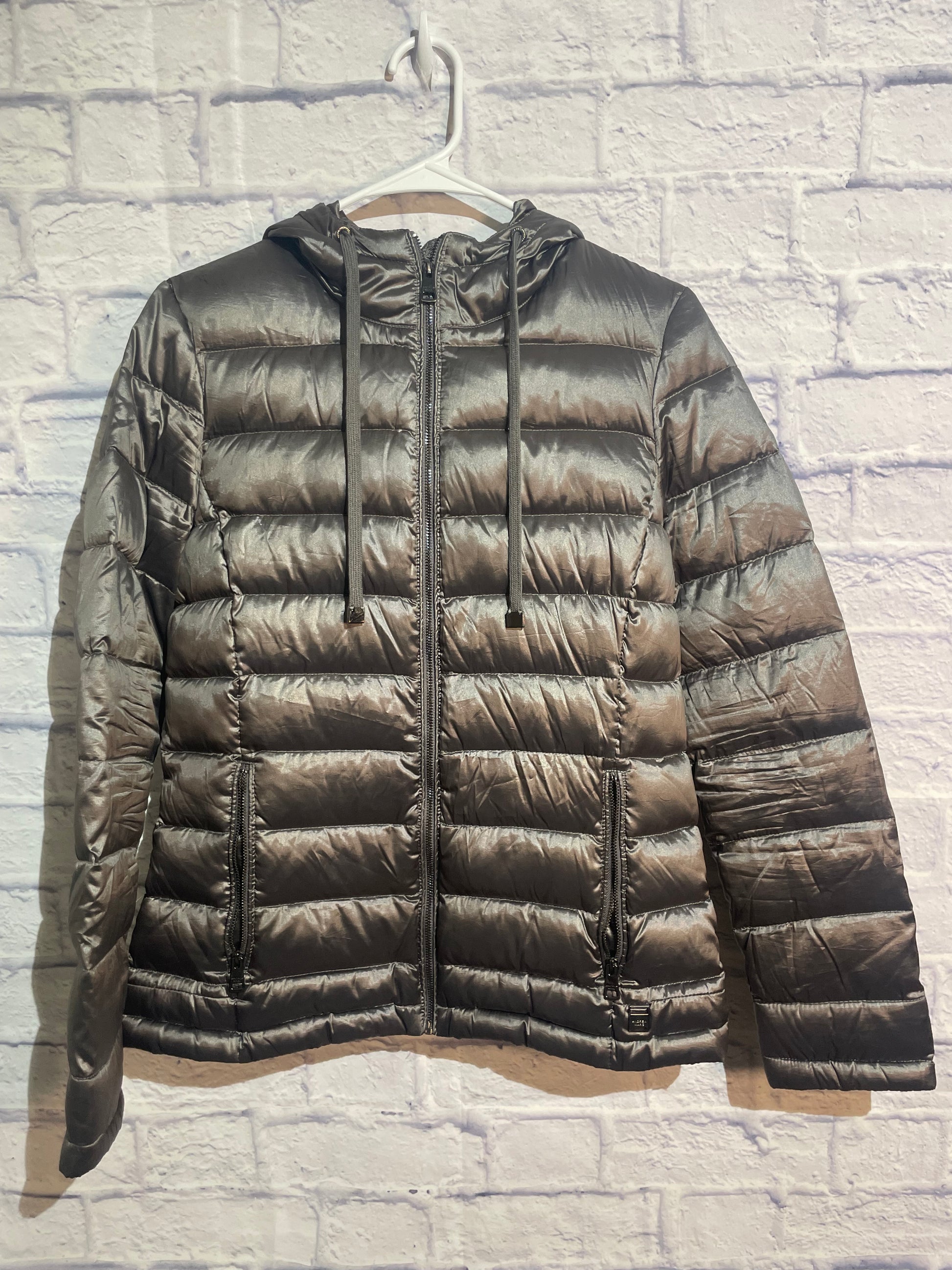 Andrew Marc Packable Lightweight Premium Down Hooded Puffer Jacket in a grey/metallic color~ Size XS