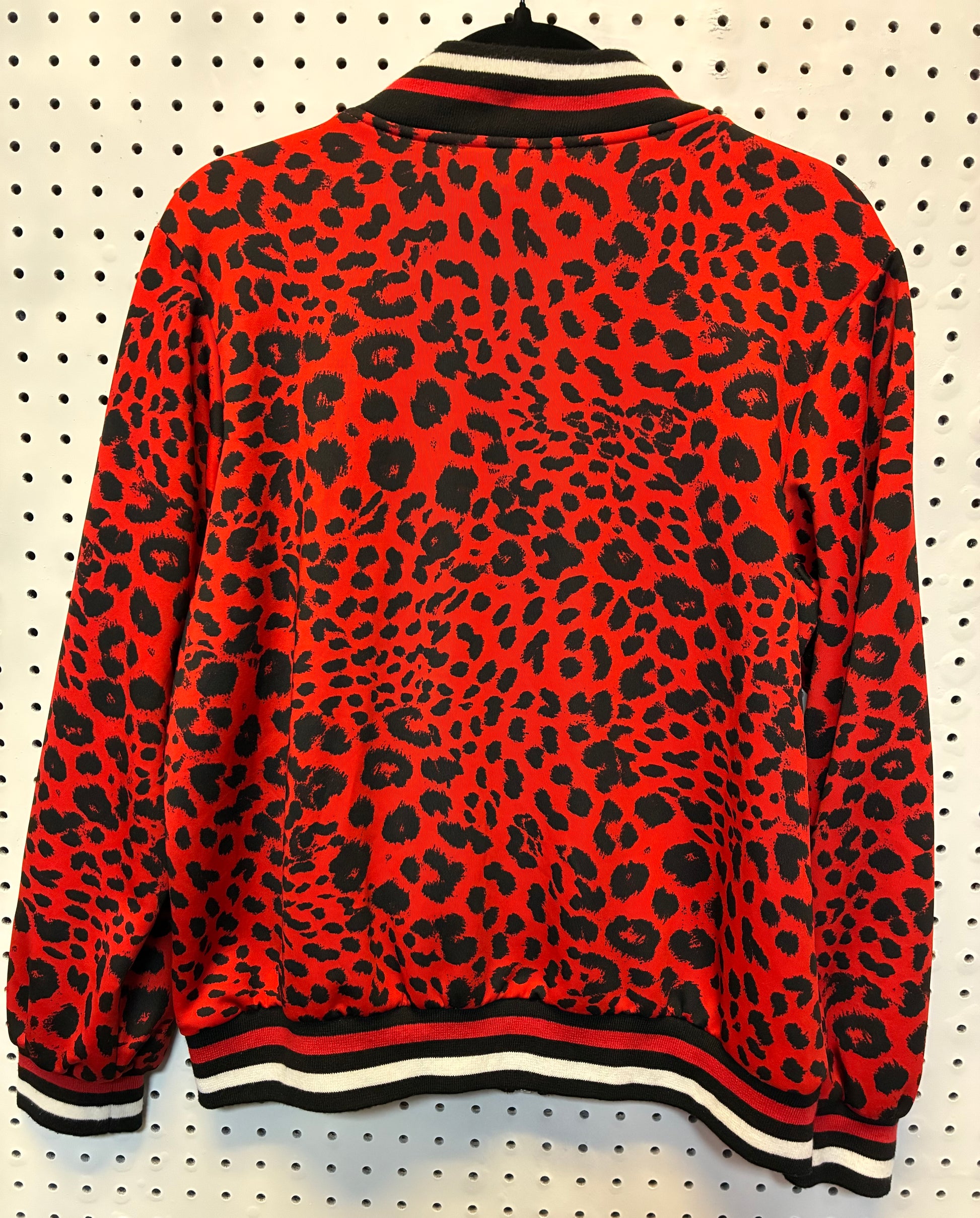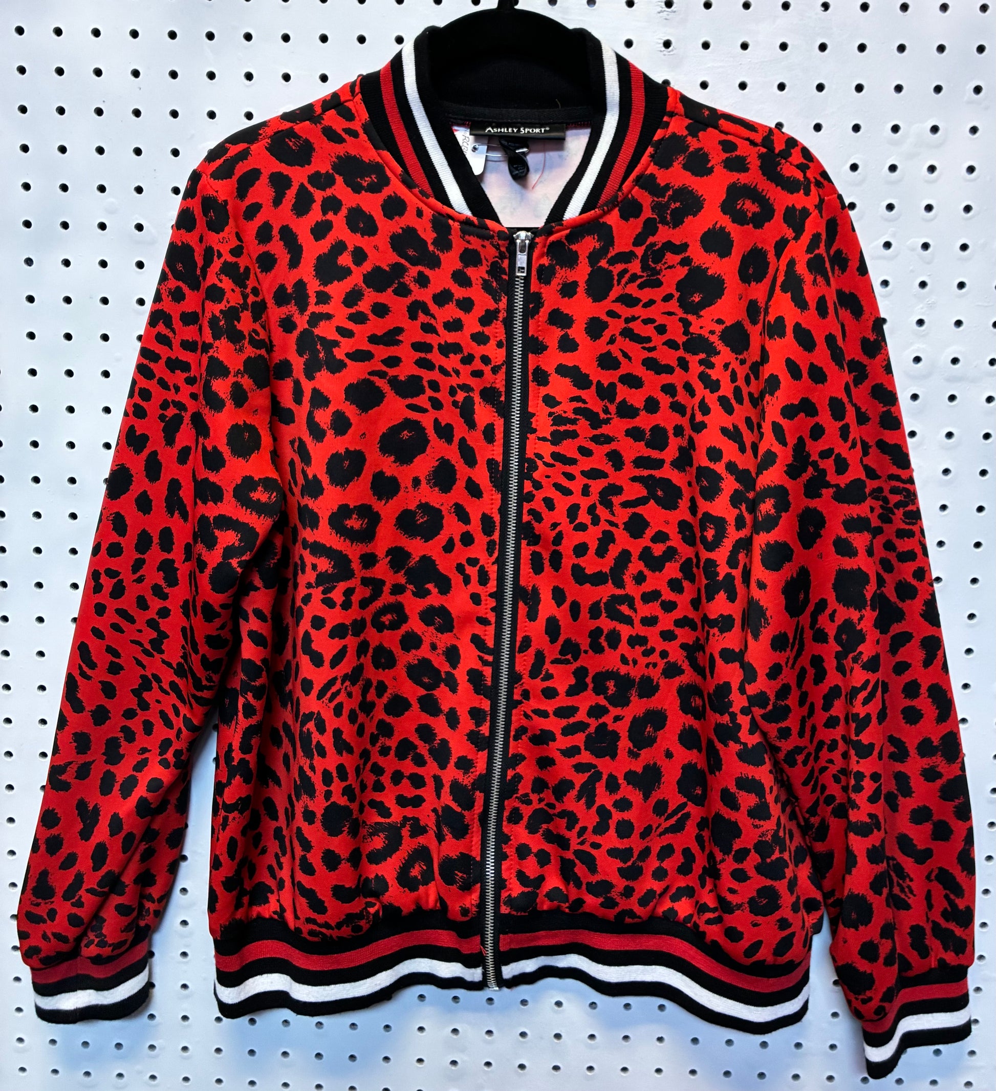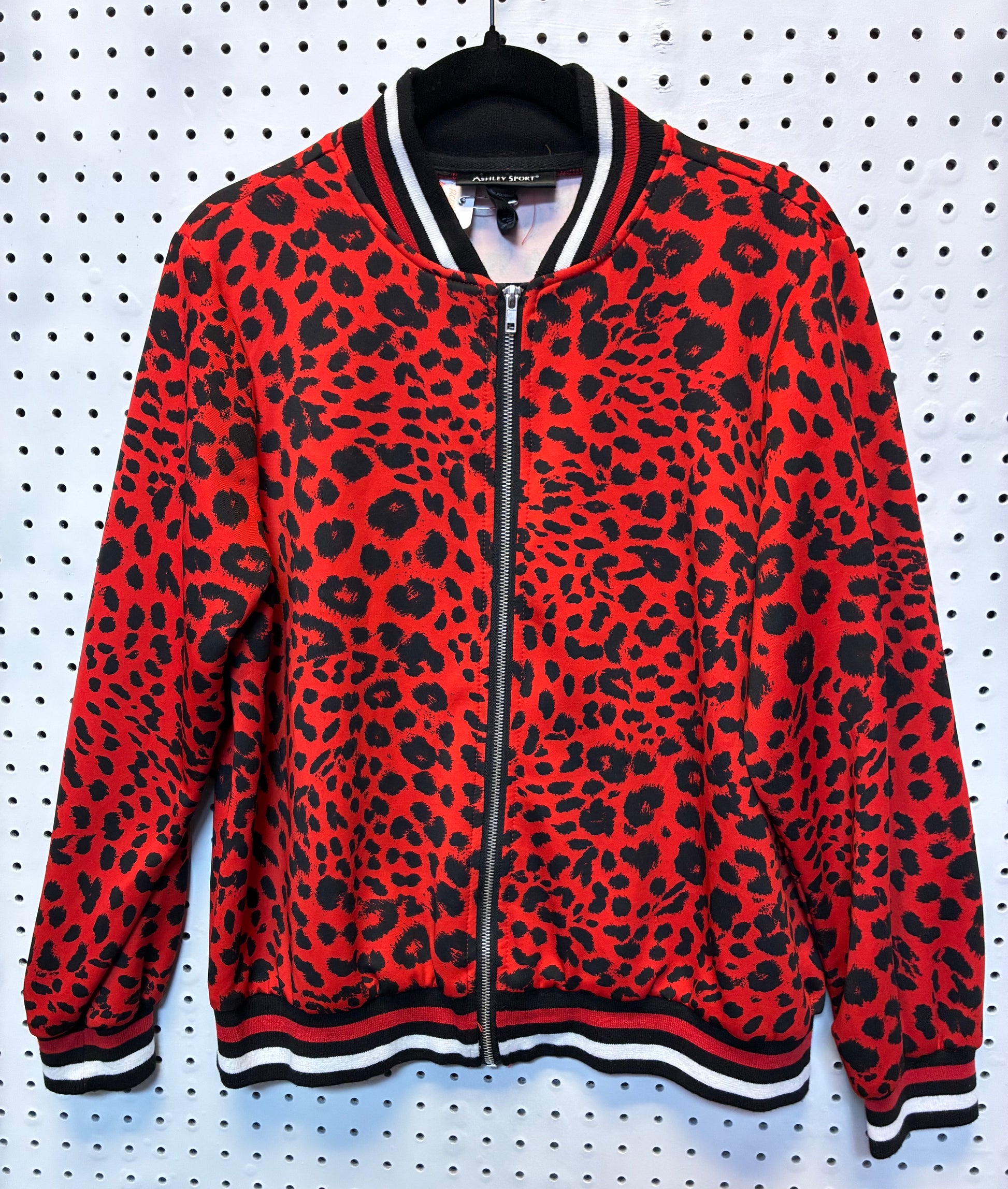#RCBB631 Condition/ Excellent - Size Large. Red and Black leopard print bomber jacket by the brand Ashley Sport. It features a full zip closure, a black knit collar, cuffs, and hem, each with white and red stripes.