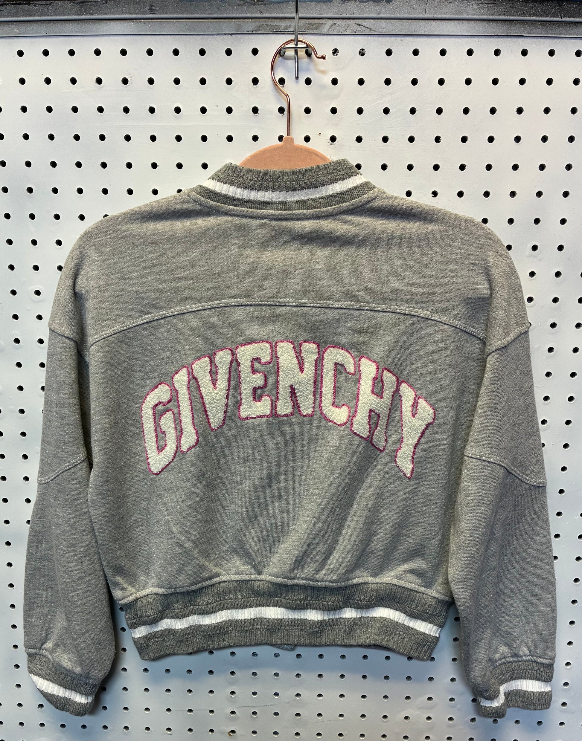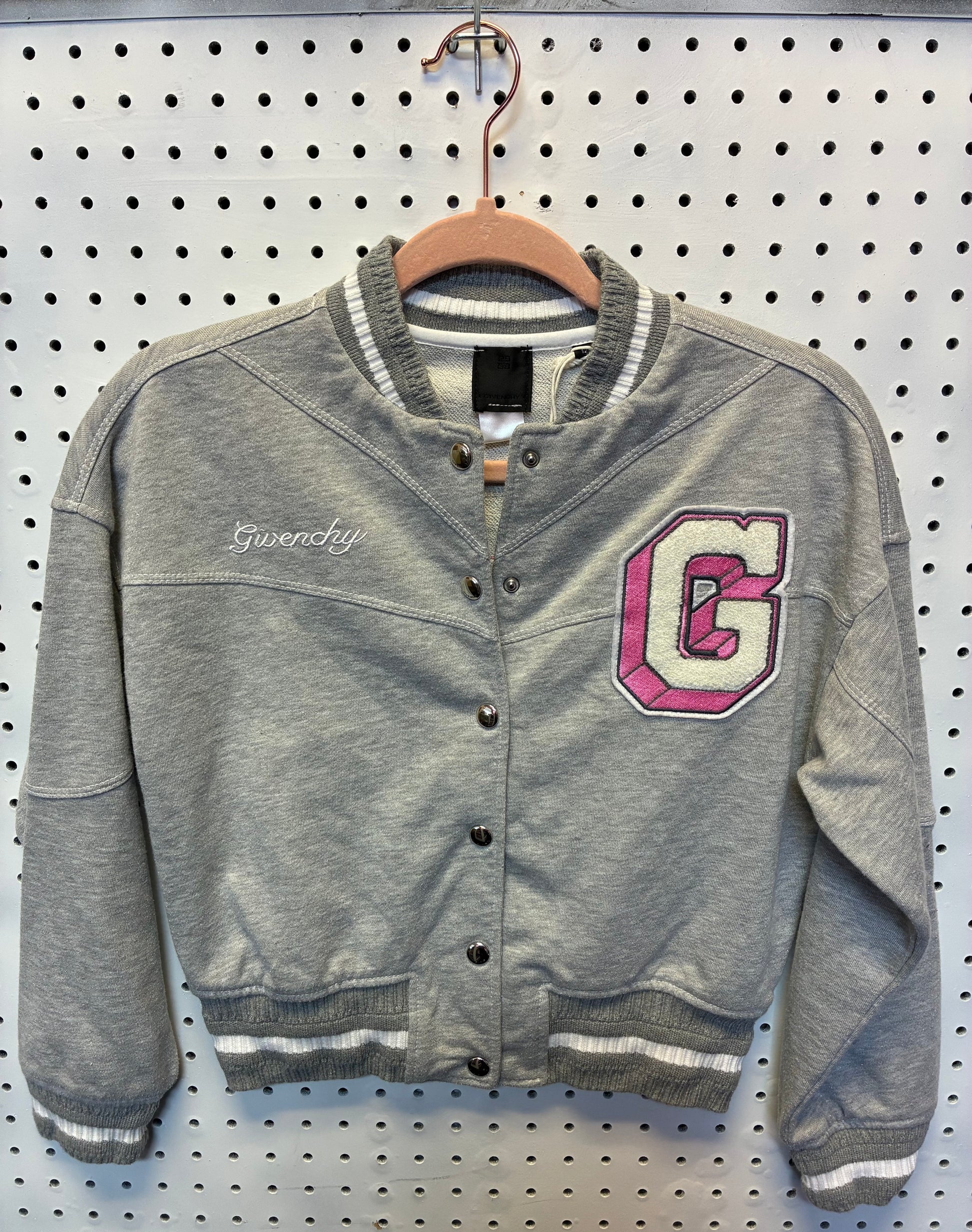 Givenchy Kids logo-patch bomber jacket in a light grey cotton blend with a pink 'G' patch Size 8/10