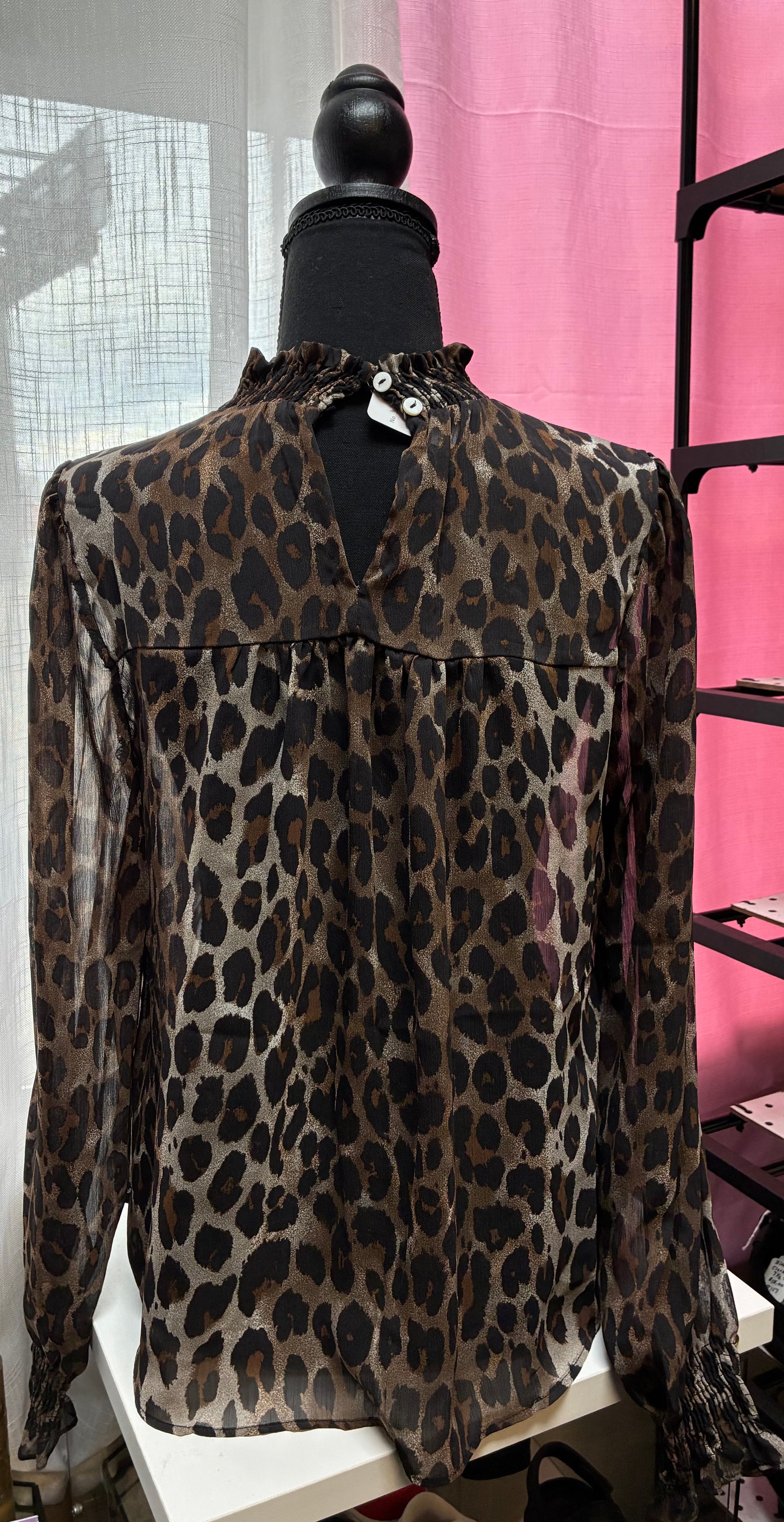 Condition / Excellent -sheer leopard print blouse, It features a high, smocked mock neck and smocked cuffs